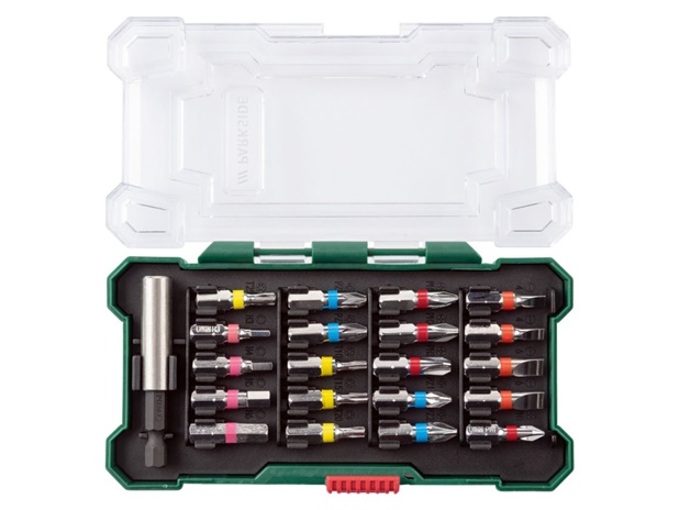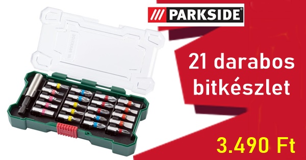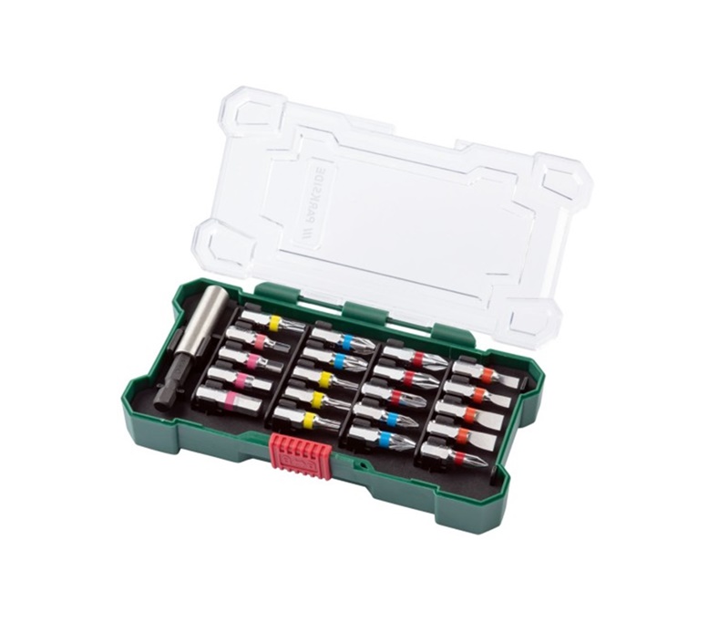 21 darabos színkódos bitkészlet. A készlet 21 bitet tartalmaz, mindegyik színkóddal a mérethez és a csavarvéghez. A bit színkódolási rendszere lehetővé teszi a gyors szerszámazonosítást. A bitek minden Parkside csavarhúzóhoz illeszkednek. A készlet tartalmaz egy fogantyút a hegyek egy kézzel történő cseréjéhez és egy aljzatot a dugókulcshoz.
