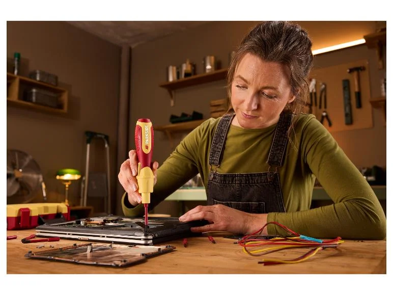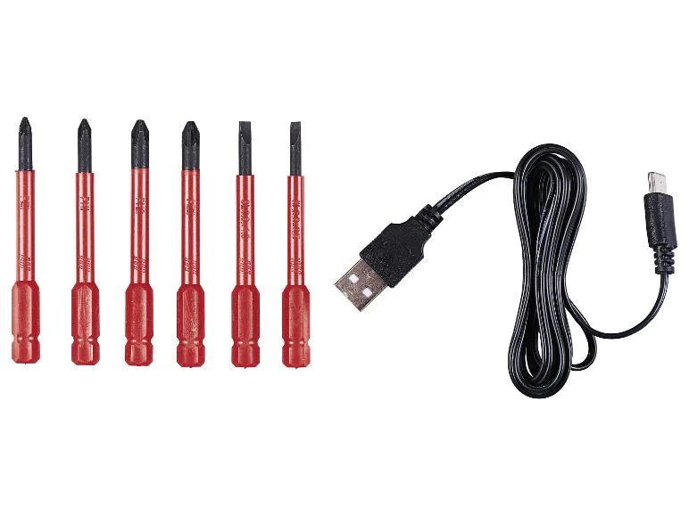 - Tartozékok: 6 speciális bit (max. 1000 V~ feszültséghez jóváhagyva), 1 USB-C töltőkábel (1,5 m)