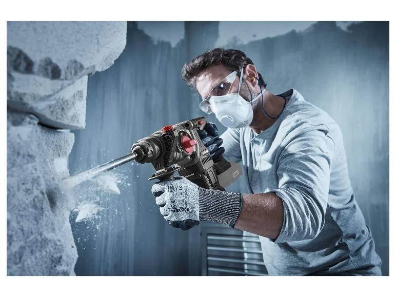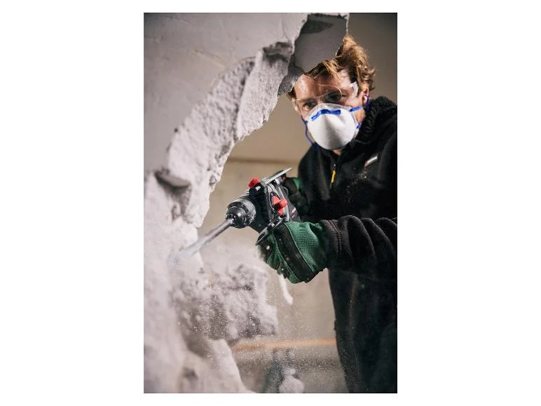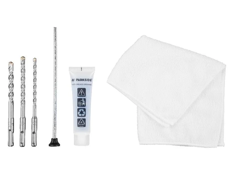 - Mellékelt tartozékok: 3 SDS fúrószár (Ø 6 / 8 / 10 mm), 1 fém mélységütköző, 1 tubus véső kenőanyag (50 g), 1 ruha