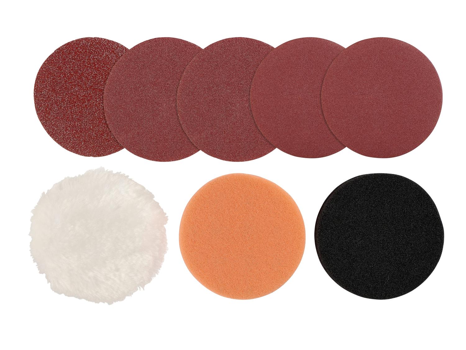 - Mellékelt tartozékok: 3 polírozó párna az előpolírozáshoz/további feldolgozáshoz/ápoláshoz, 5 darabos csiszolópapír készlet 3 szemcsés (1 x 60, 2 x 120, 2 x 240)