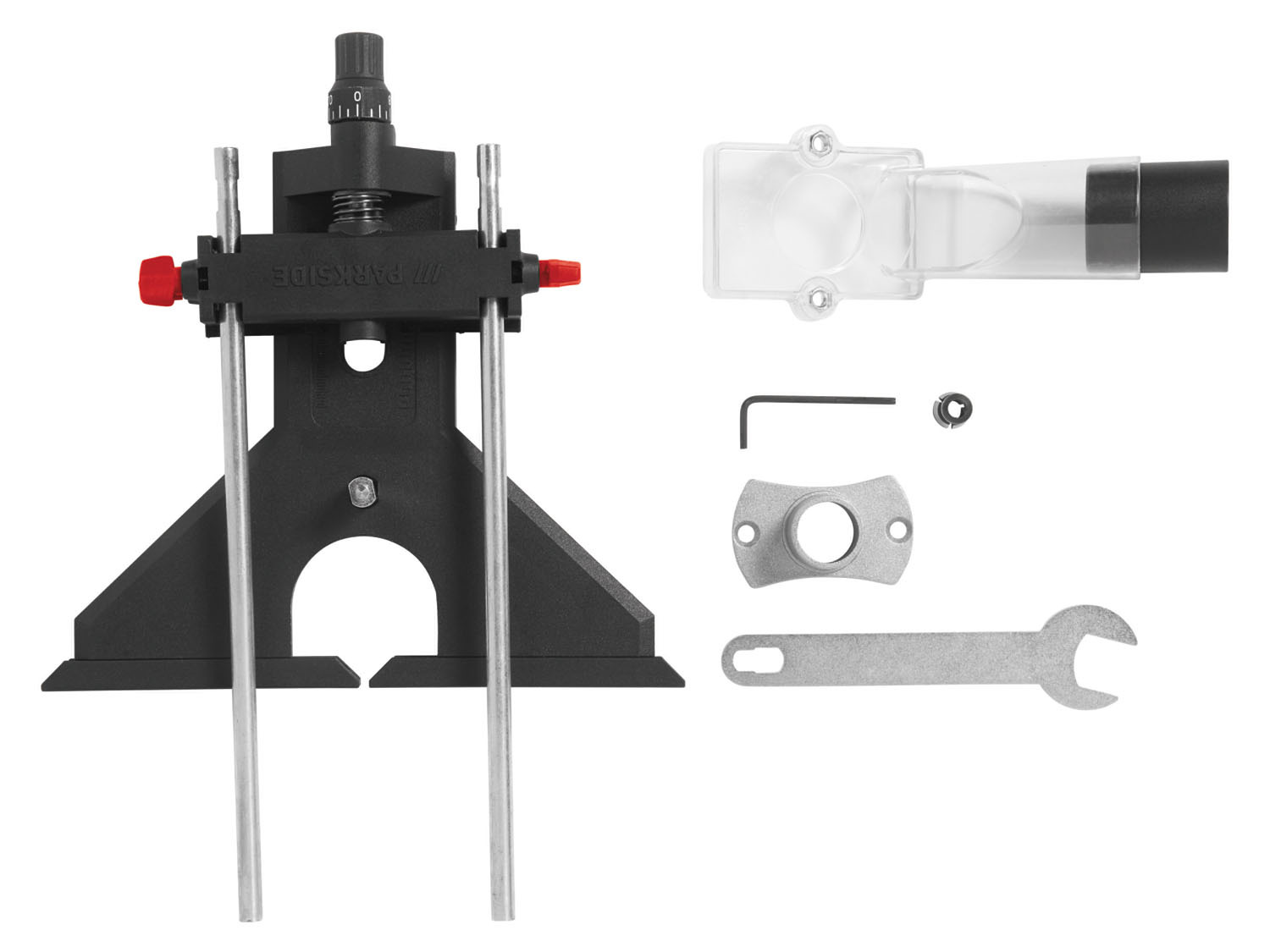 Mellékelt tartozékok: 6 darabos favágó készlet, 2 tokmány (6 és 8 mm, egy előre összeszerelt), 1 párhuzamos ütköző finombeállítással, 1 másolótok, 1 kíváncsi iránytű, 1 adapter külső porelszíváshoz, beleértve a porcsökkentést is, 1 villáskulcs, 1 hatlapfejű kulcs