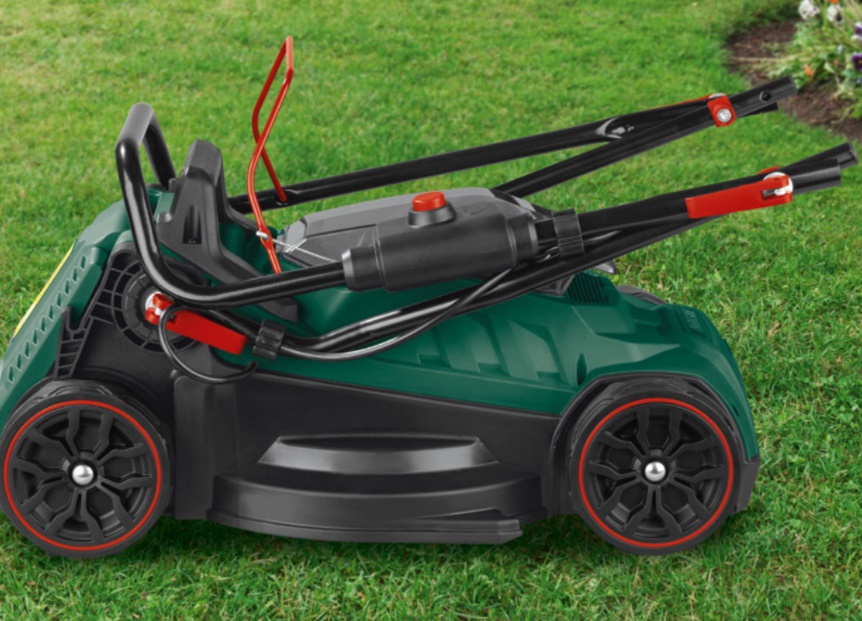 Összecsukható fogantyúval a helytakarékos tároláshoz. Praktikus gyűjtőtartály  tartozék a levágott fű könnyed eltávolításához vagy akár optimális újrafelhasználásához műtrágyaként.