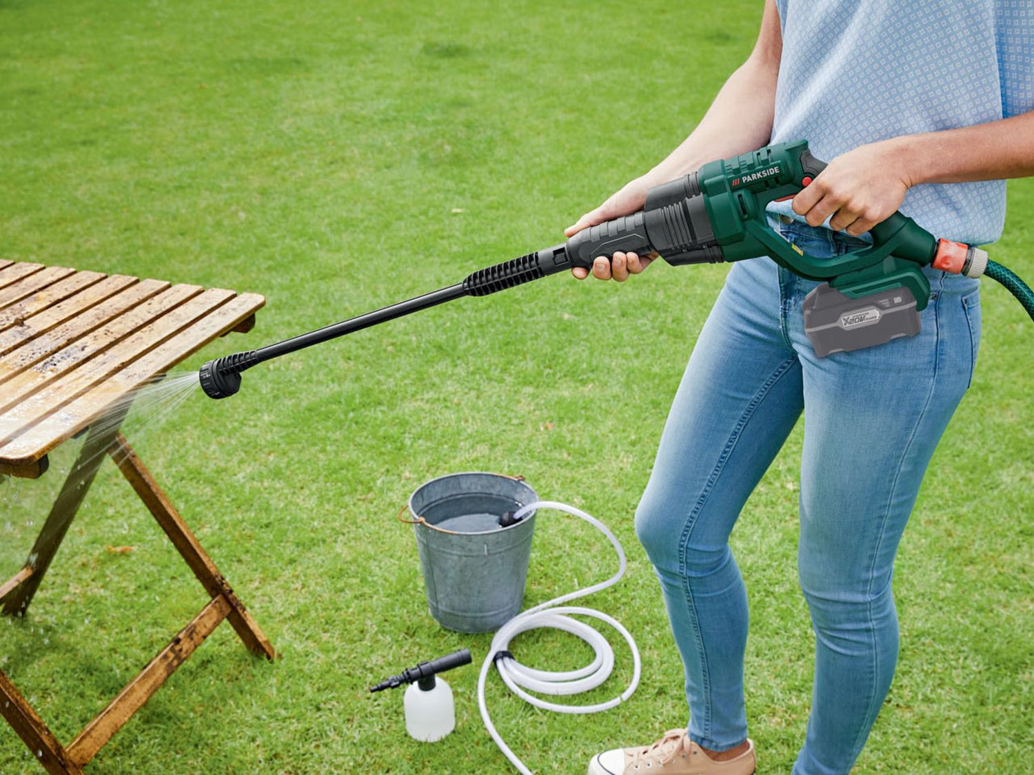 Mellékelt tartozékok: 1 szórócső praktikus multifunkcionális fúvókával, 1 fúvóka mosószer tartállyal (kb. 400 ml), 6 m-es szívótömlő szűrőkosárral, 1 mosószeres flakon (500 ml), 1 szállítóháló