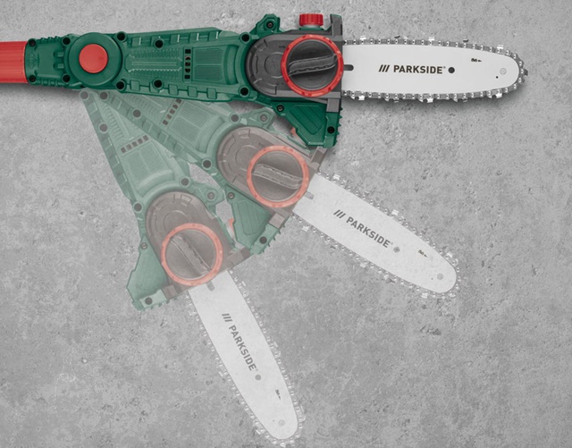 – Dönthető fűrészfej az optimális vágásvezetéshez nehezen hozzáférhető helyeken is