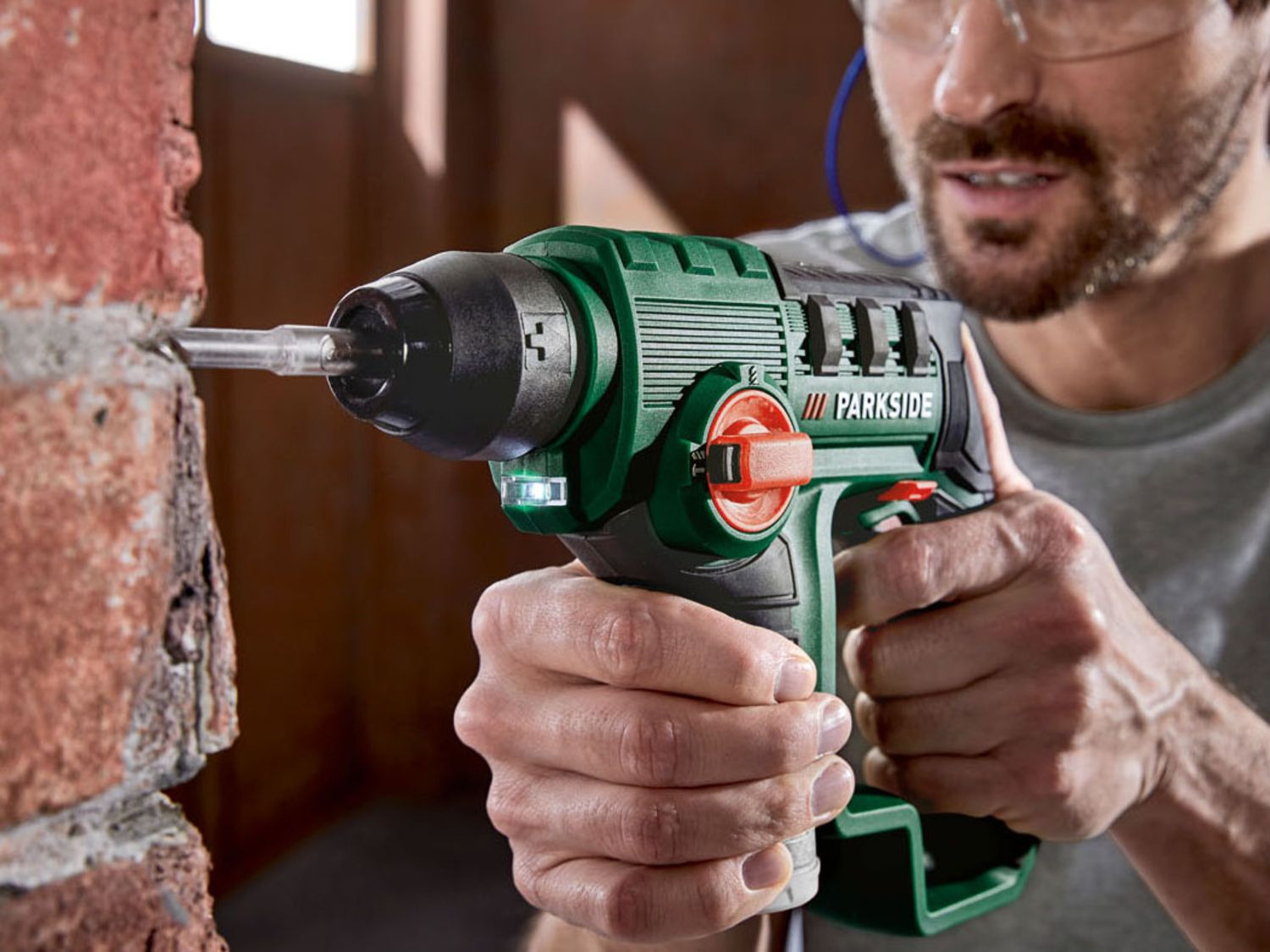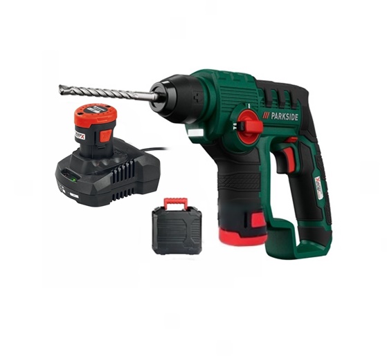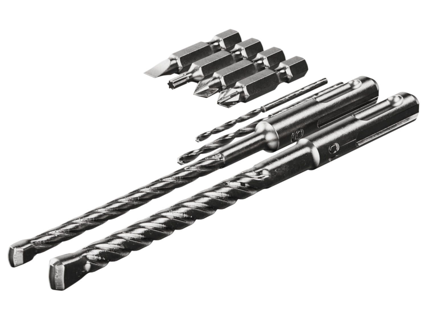 Tartozékok: gyorsbefogó tokmány kerek szárú fúrókhoz, 2 db SDS betonfúró (6 mm / 8 mm), 2 db kerek szárú fafúró (3 mm / 5 mm), 4 db 50 mm-es csavarfej (S2 / PH2 / PH1 / TX25) )