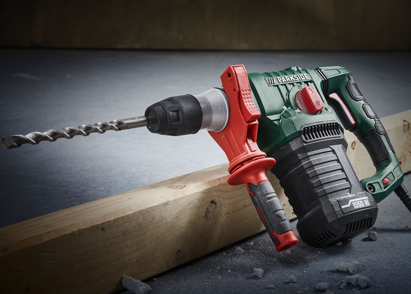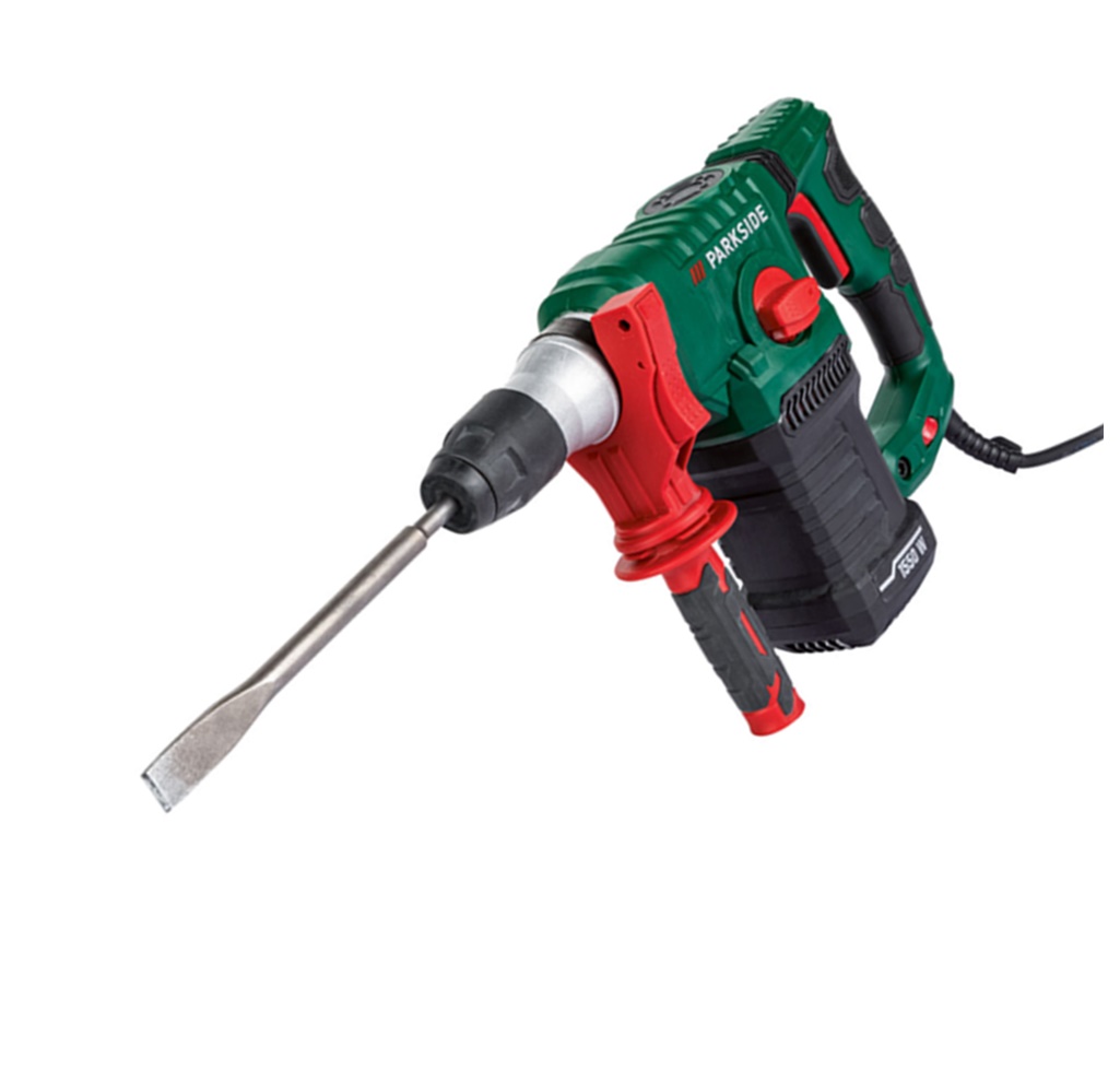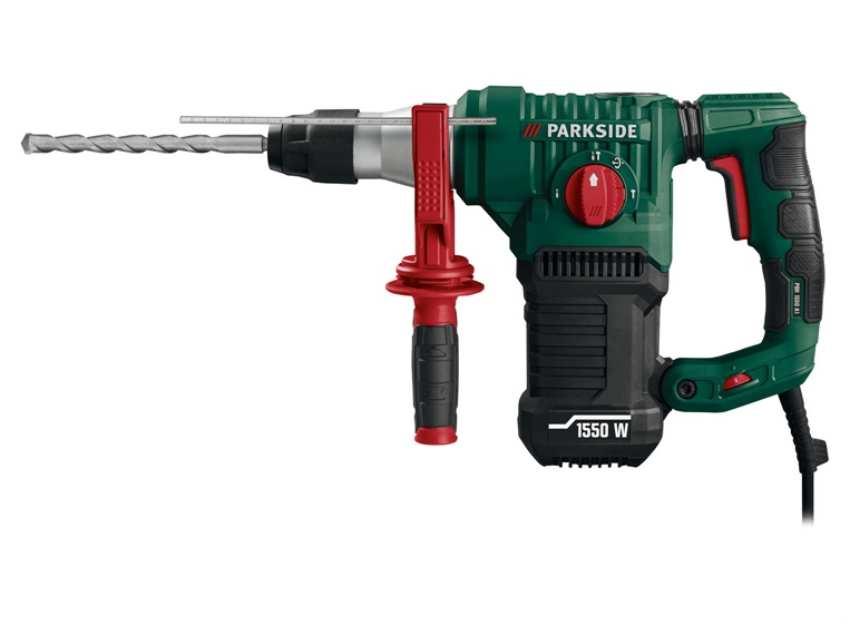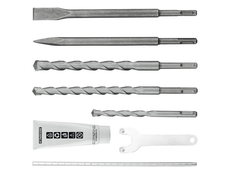 - Tartozékok: 1 éles véső (250 mm), 1 lapos véső (250 mm), 3 SDS fúró (12 x 160 mm, 16/18 x 250 mm), 50 g szerszám kenőanyag, 1 mélységütköző, 1 tokmány fogazott peremmel , 1 kulcs a tokmányhoz, 1 kulcs a szerszám fedeléhez