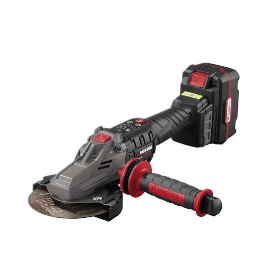 - Tartozékok: 1 akkumulátor, 1 töltő, 2 nagyoló tárcsa fémhez, 2 vágótárcsa fémhez (1 előre összeszerelt), 1 első fogantyú (előre szerelve), 1 szorítókulcs (elülső fogantyúban tárolva), 2 az 1-ben védőburkolat (előre szerelve)