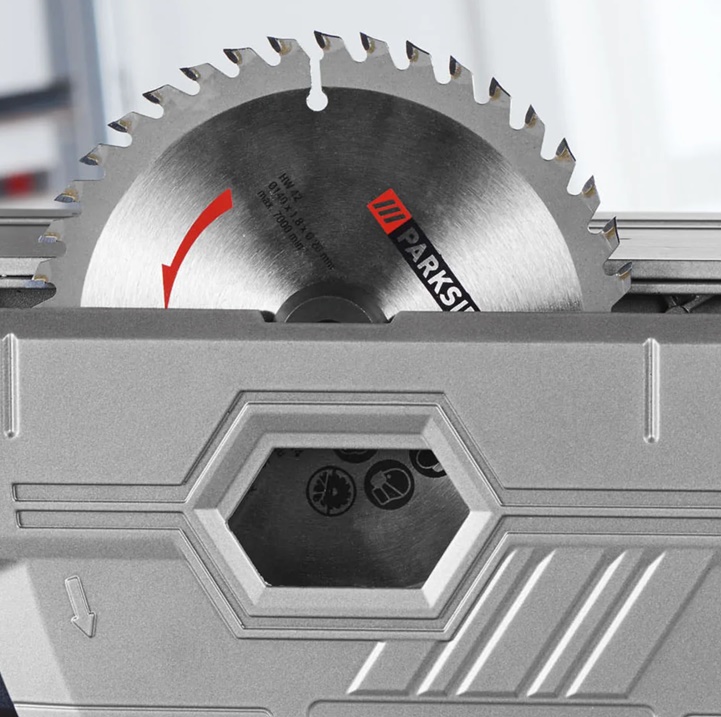 - Mellékelt tartozékok: 1 univerzális fűrészlap Ø 140 mm 42 foggal (előre összeszerelve), 1 párhuzamos kerítés, 2 részes vezetősín rögzítővel, 2 imbuszkulcs, 1 szűkítő (előre összeszerelve)