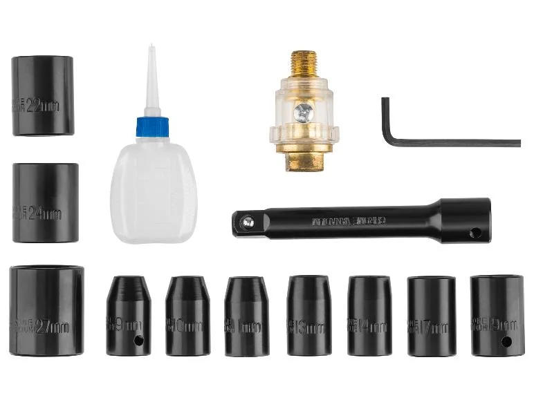 - Mellékelt tartozékok: 10 dugaszolókulcs, 1 hosszabbító, 1 db 6,35 mm-es (¼”) dugós csatlakozó (előre összeszerelve), 1 zsírzógomb, 1 palack sűrített levegős olaj, 1 hatlapfejű kulcs
