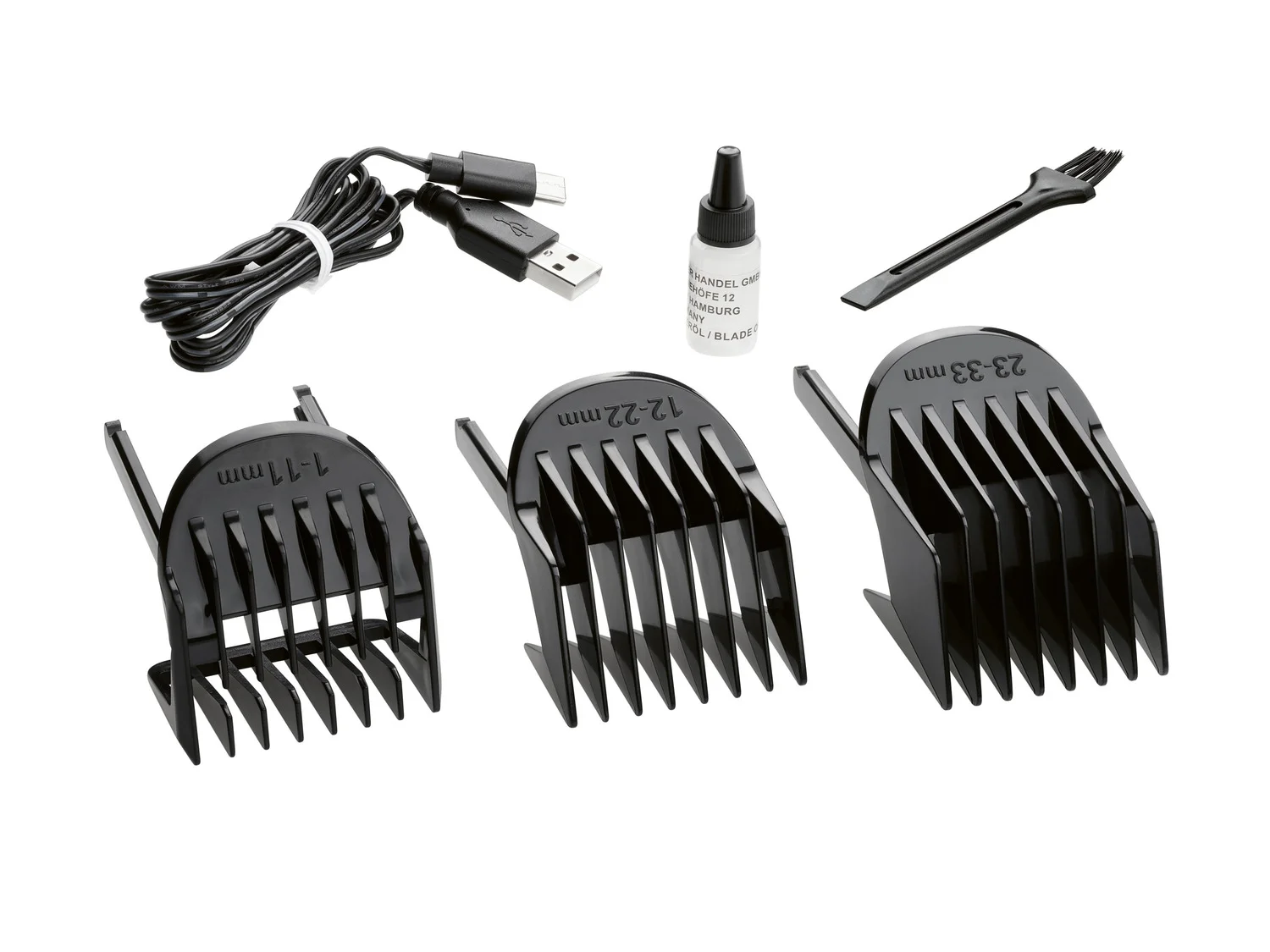 - 3 változtatható dugaszolható fésűt, tisztítókefét, olajat és töltőkábelt tartalmaz (USB A–USB C)