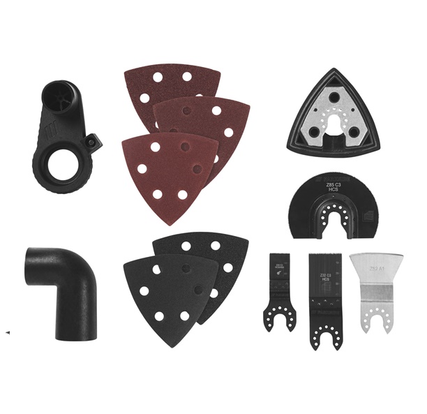 • Tartozékok: 2 merülőfűrészlap, 1 szegmensfűrészlap, 1 kaparó, 1 delta csiszolólap, 18 csiszolólap, 1 porelszívó adapter